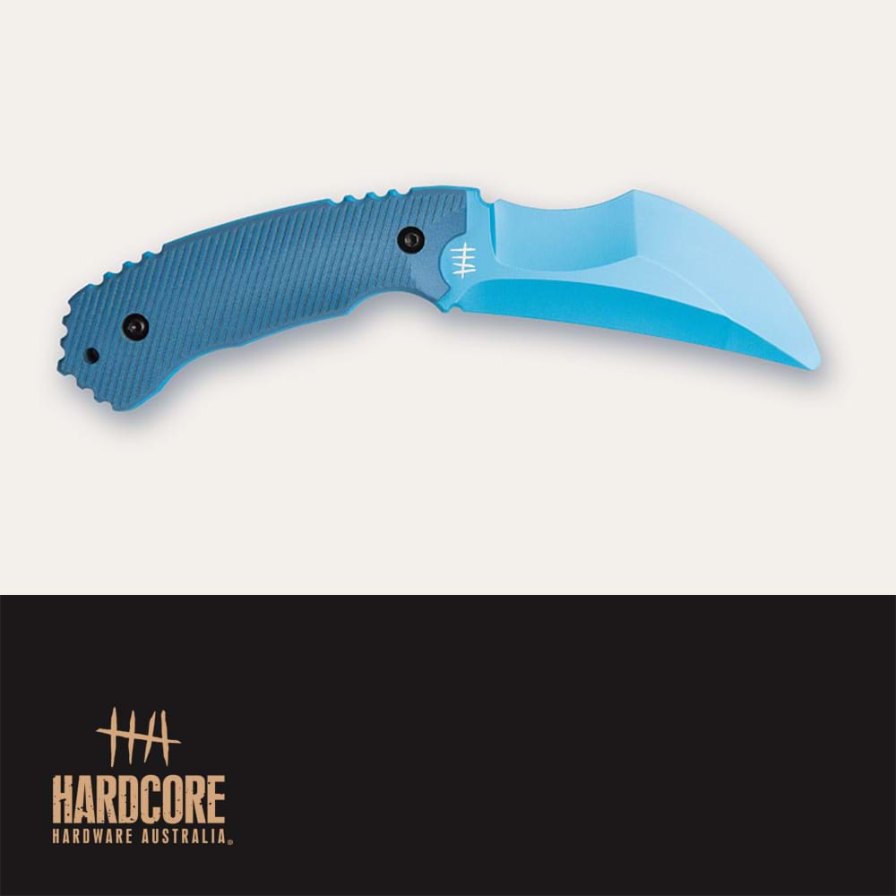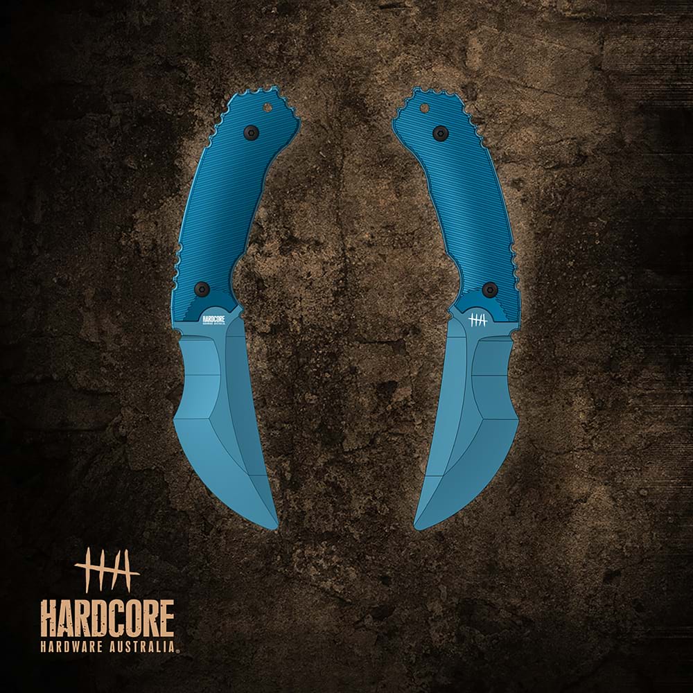 To facilitate real world training scenarios the Hardcore Hardware Australia RAZORBACK CQB-01 Trainer model is almost identical in dimensions and weight to its live edged counterpart. The HIVIZ blue, non-sharpened 'safe edge' trainer is also fully compatible with the live edge sheath system. (SHEATH NOT INCLUDED)