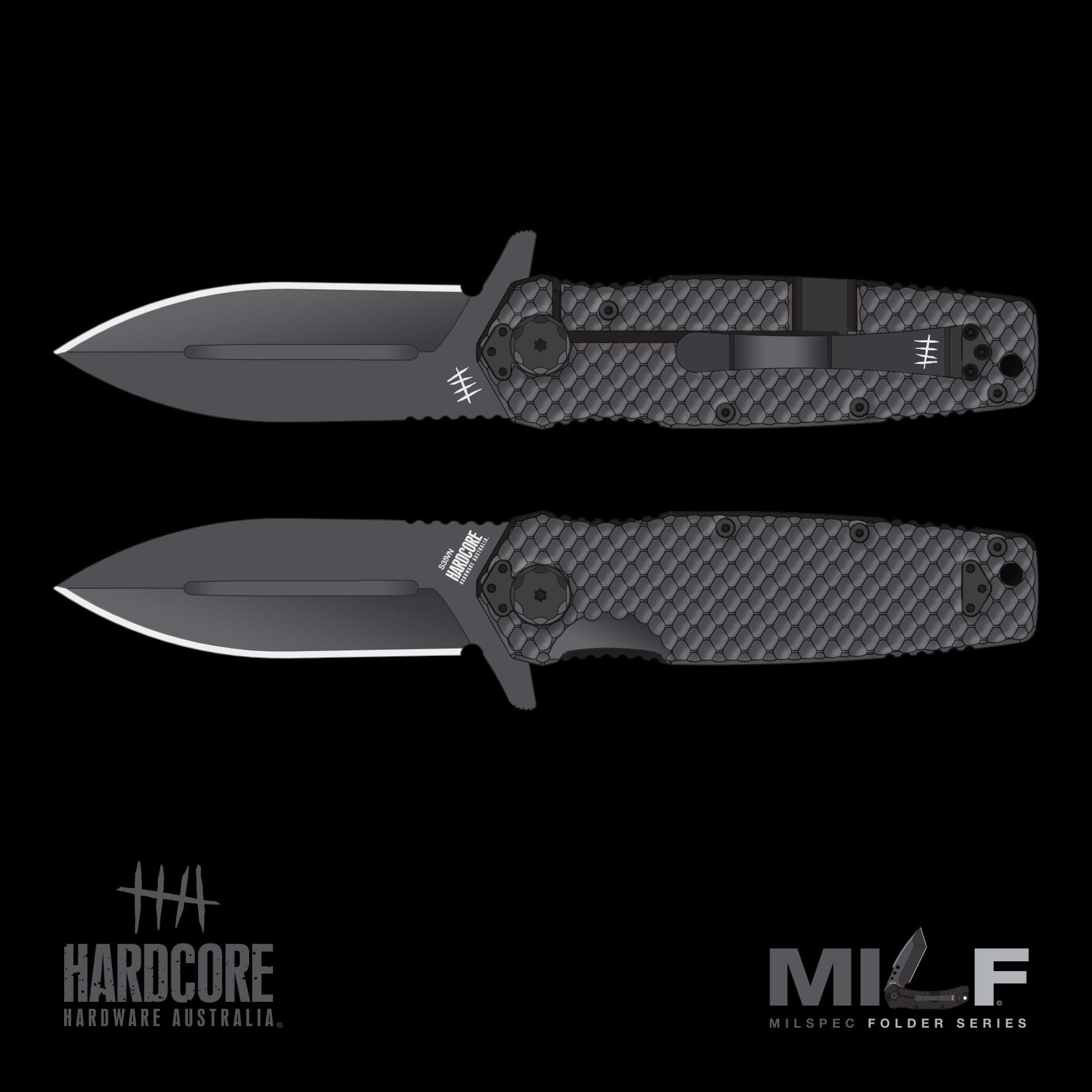 The MILF-05 from Hardcore Hardware Australia is a mid-sized Spear point utility folding knife, offering the optimum balance between weight, strength, and cutting power.