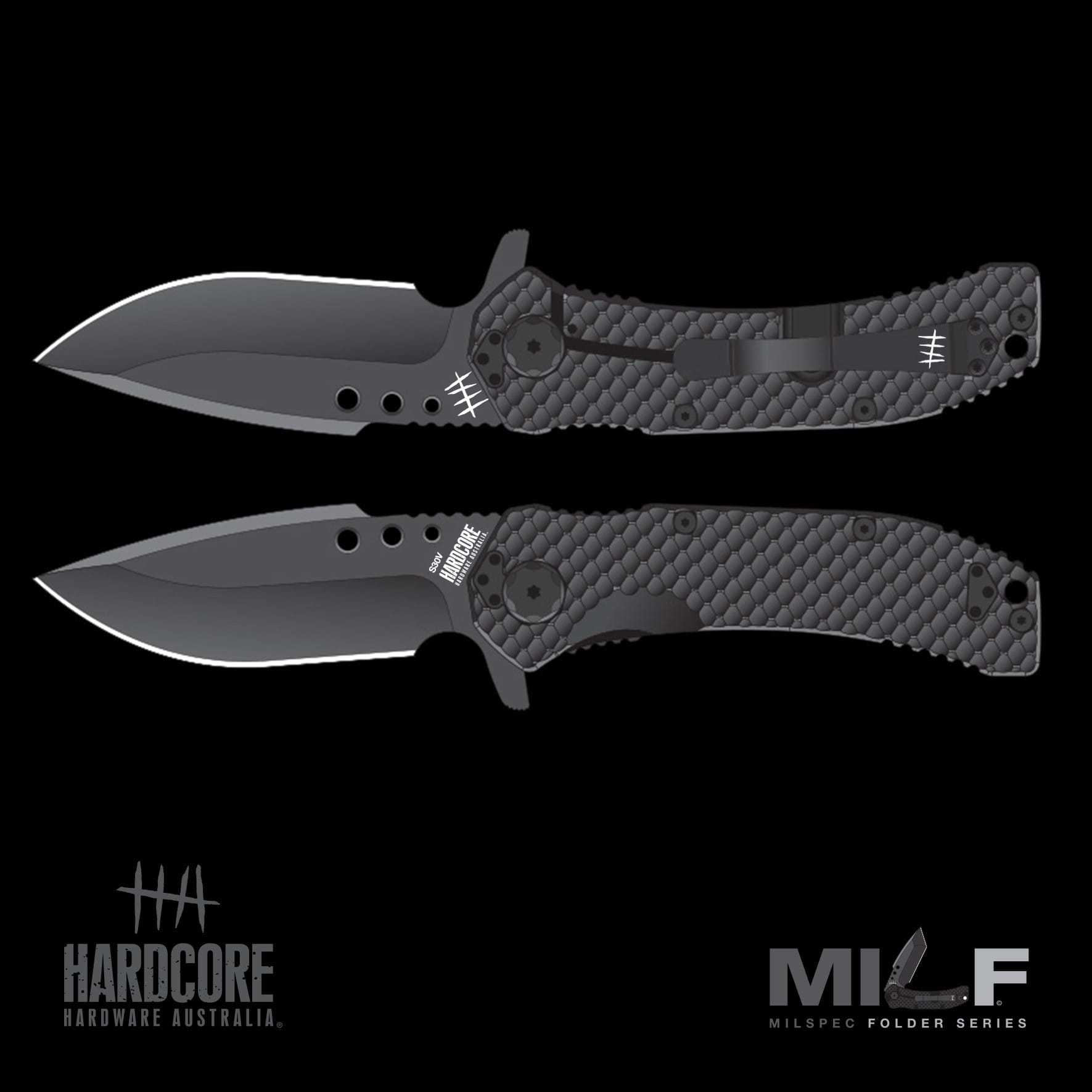 The MILF-02 from Hardcore Hardware Australia is a mid-sized Drop Point utility folding knife, offering the optimum balance between weight, strength, and cutting power.